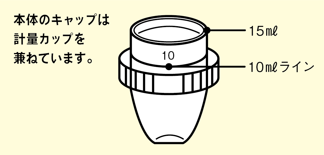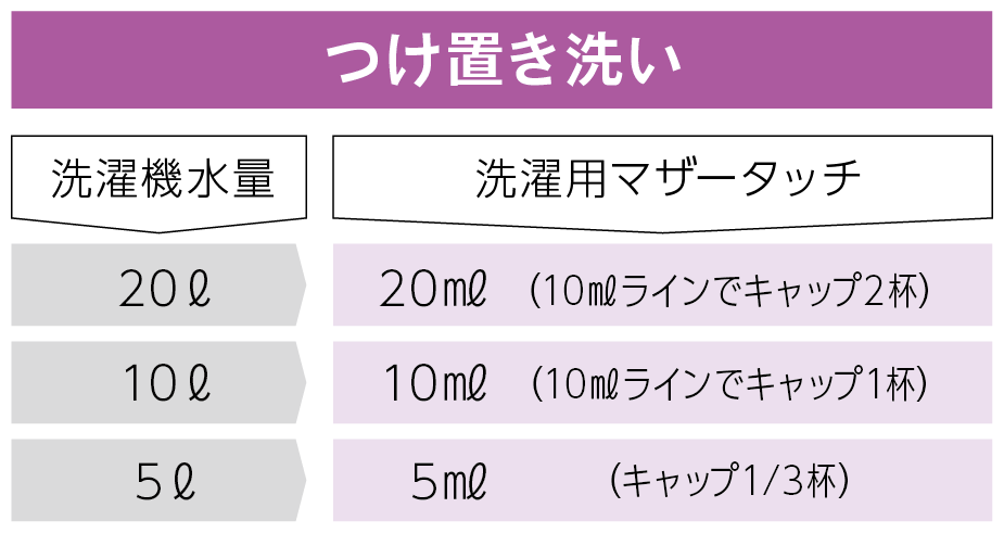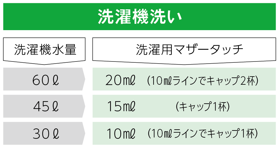 容量は、30ℓの洗濯水に対しては10㎖、45ℓの洗濯水に対しては洗濯用マザータッチは15㎖です。